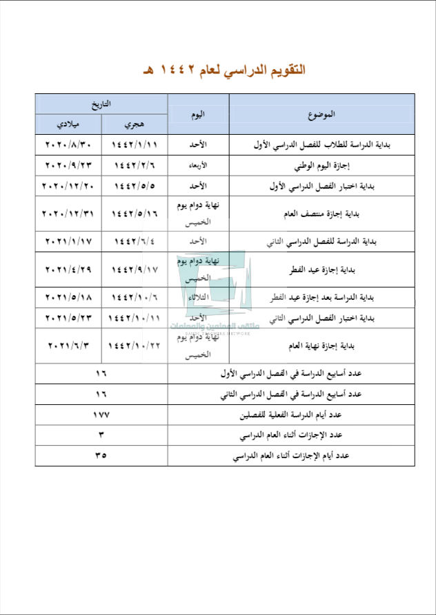 التقويم الدراسي ١٤٤٢
